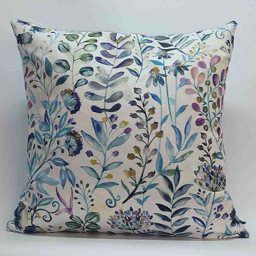 A soft lilac cushion with an intricate floral design. The floral pattern captures the beauty of combining pink, purple, green and blue tones togeth...