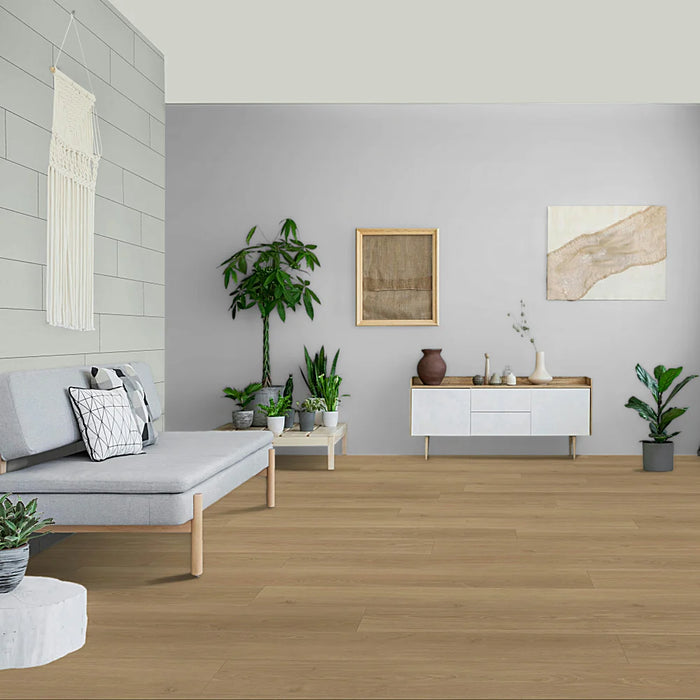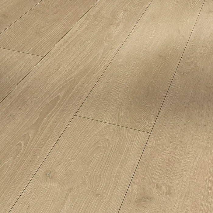 This 8mm thick laminate is water-resistant for up to 1 hour and suitable for bathrooms and kitchens thanks to its Aqua-Proof core and edge swell protection. Easy to install with the SafeLock® PRO click system, it also works with underfloor heating and cooling systems, and comes with a lifetime residential guarantee.